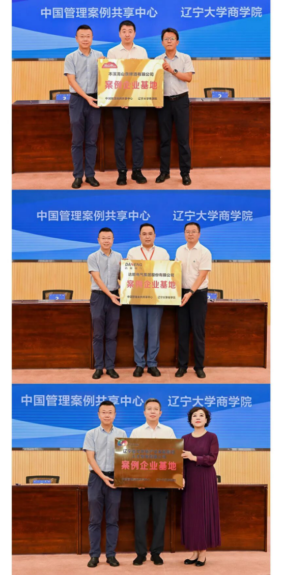 The China Management Case Sharing Center and the Business School of LNU successively signed corporate case base cooperation agreements and awarded plaques to Benxi Long Shan Quan Beer Co., Ltd., Daneng Electric Group Co., Ltd., and the Talent Development Company of Liaoning Provincial Culture, Sports and Tourism Industry Development Group.