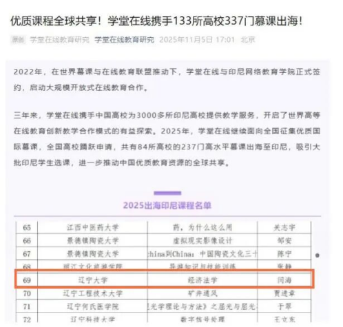 To promote the global sharing of high-quality legal education resources, the “Economic Law” course offered by Liaoning University School of Law was selected for inclusion on Indonesia’s national MOOC platform. Through the Xuetang MOOC platform, the course has now reached a global audience, successfully achieving the “export of MOOCs.”