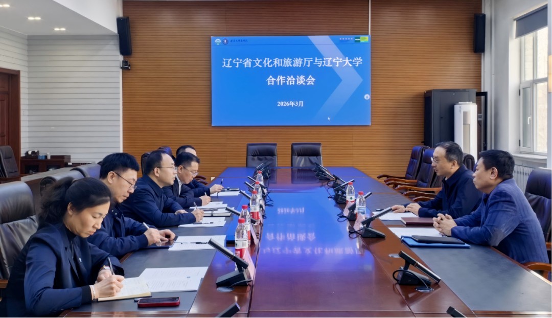 On March 17, 2026, a delegation led by Wu Bing, Deputy Director of the Liaoning Provincial Department of Culture and Tourism, visited Liaoning University (LNU) for a special research on comprehensive strategic cooperation. Qiu Huanguang, Member of the Standing Committee of the Party Committee and Vice President of LNU, attended the meeting. Wei Wenfei, Grade III Researcher of the Science, Technology and Education Division of the Liaoning Provincial Department of Culture and Tourism, also participated in the event.