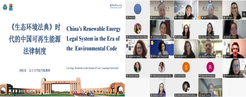 To widely disseminate the Ecological and Environmental Code to the world, the latest achievement in China’s ecological and environmental rule of law, at 19:00 Beijing Time on March 19, Professor Liu Jiaqi from the Law School of Liaoning University (LNU) was invited to deliver a special report titled “China’s Renewable Energy Legal System in the Era of the Ecological and Environmental Code” for faculty and postgraduate students from Brazilian universities and research institutions, including the Federal University of Paraíba-UFPB. Professor Ana Paula Basso from the Center for Legal Sciences of the Federal University of Paraíba-UFPB, and Professor Ma Haitian, Vice Dean of the Liaoning Intellectual Property School of LNU, jointly hosted the event online and delivered opening remarks respectively.